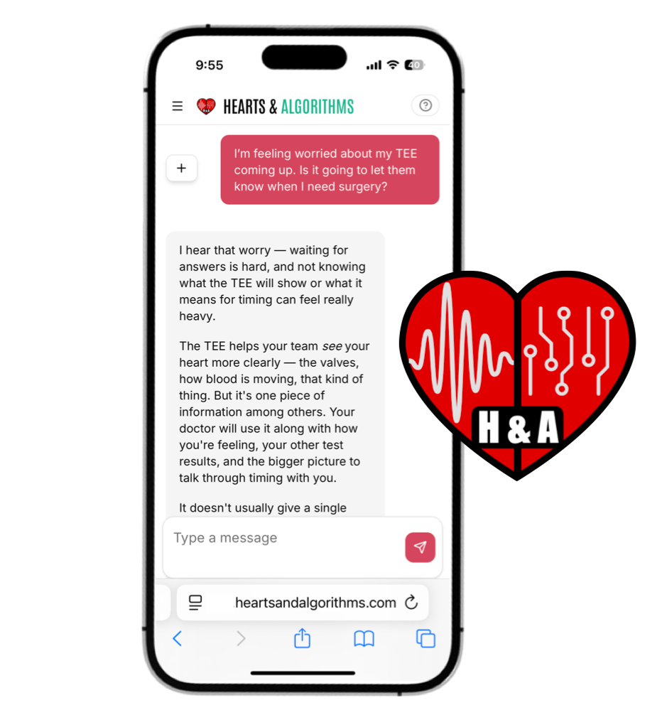 Hearts & Algorithms is an AI-powered care companion designed to support patients and caregivers through complex medical journeys, starting with cardiac care. It sits between appointments and alongside clinical teams, helping patients understand what is happening, prepare for what is next, and manage the emotional and cognitive burden they face.Built from John and others' lived patient experience and refined through real-world use, Hearts & Algorithms provides continuous, stage-aware guidance that improves patient comprehension and confidence.